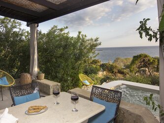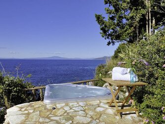 Diese helle und luftige Unterkunft mit unglaublichem Meerblick verkörpert Minimalismus und Modernität für einen luxuriösen Aufenthalt mit Blick auf die steilen Hügel des Peloponnes und das himmlische blaue Meer.