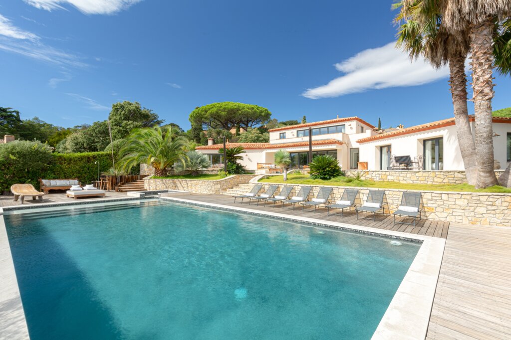 Villa Riviera is a stunning five-bedroom retreat near the medieval village of Grimaud, offering elegant indoor-outdoor living, a private pool and jacuzzi, and sweeping views over the bay of St Tropez.
