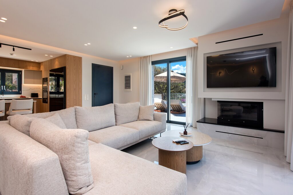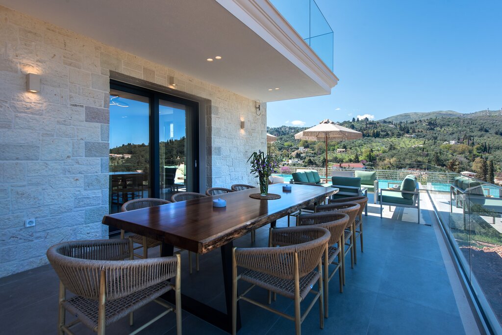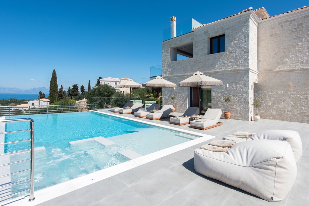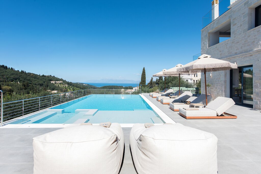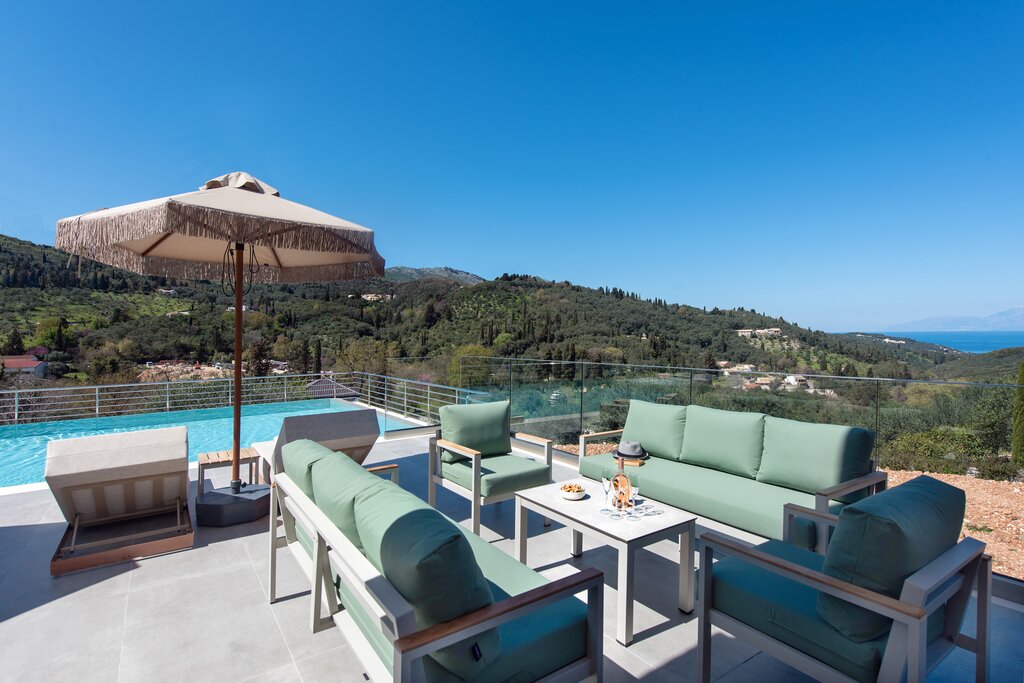 This refined villa enjoys stylish living spaces, generous terraces and a stunning roof terrace with panoramic views across the Ionian Sea.