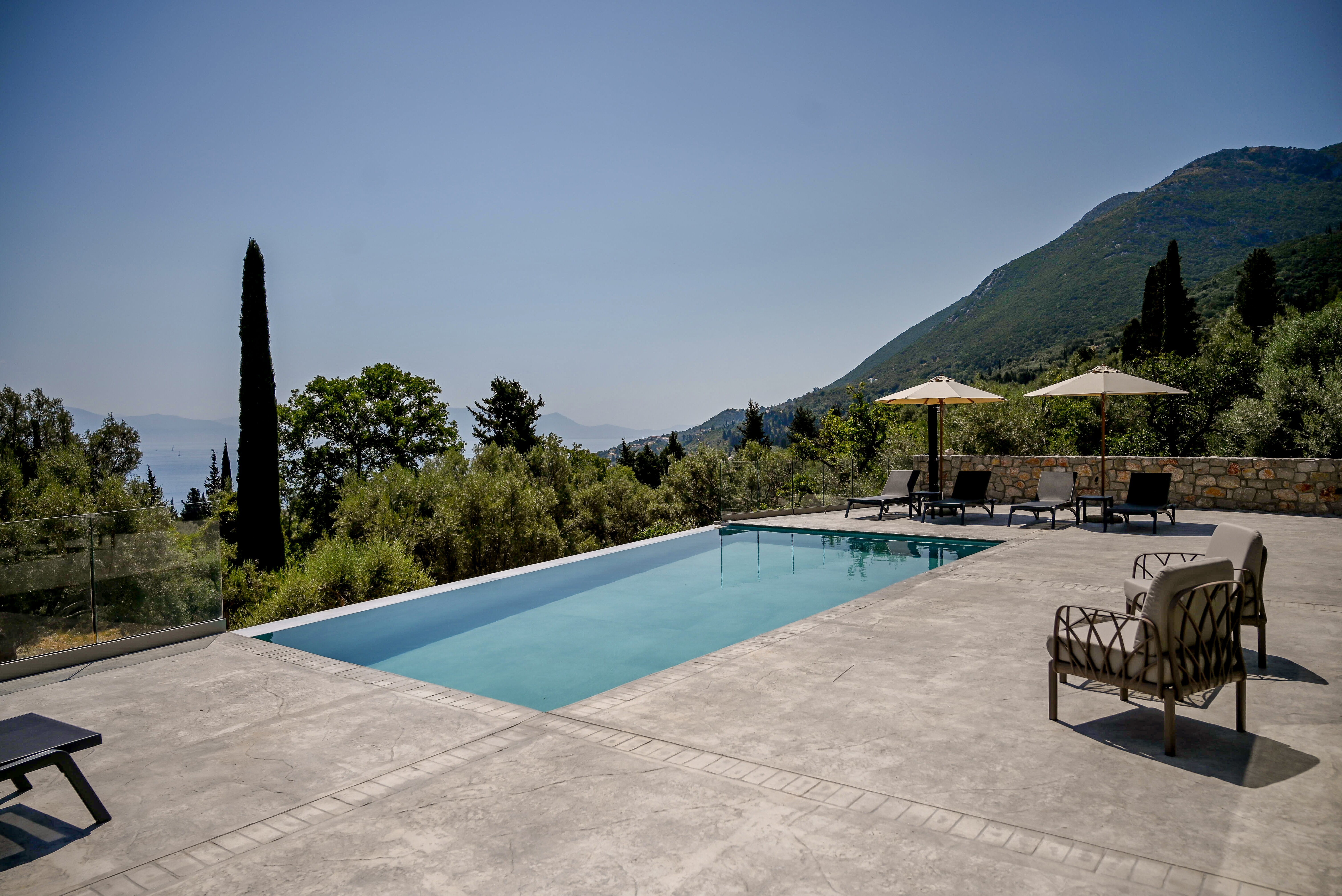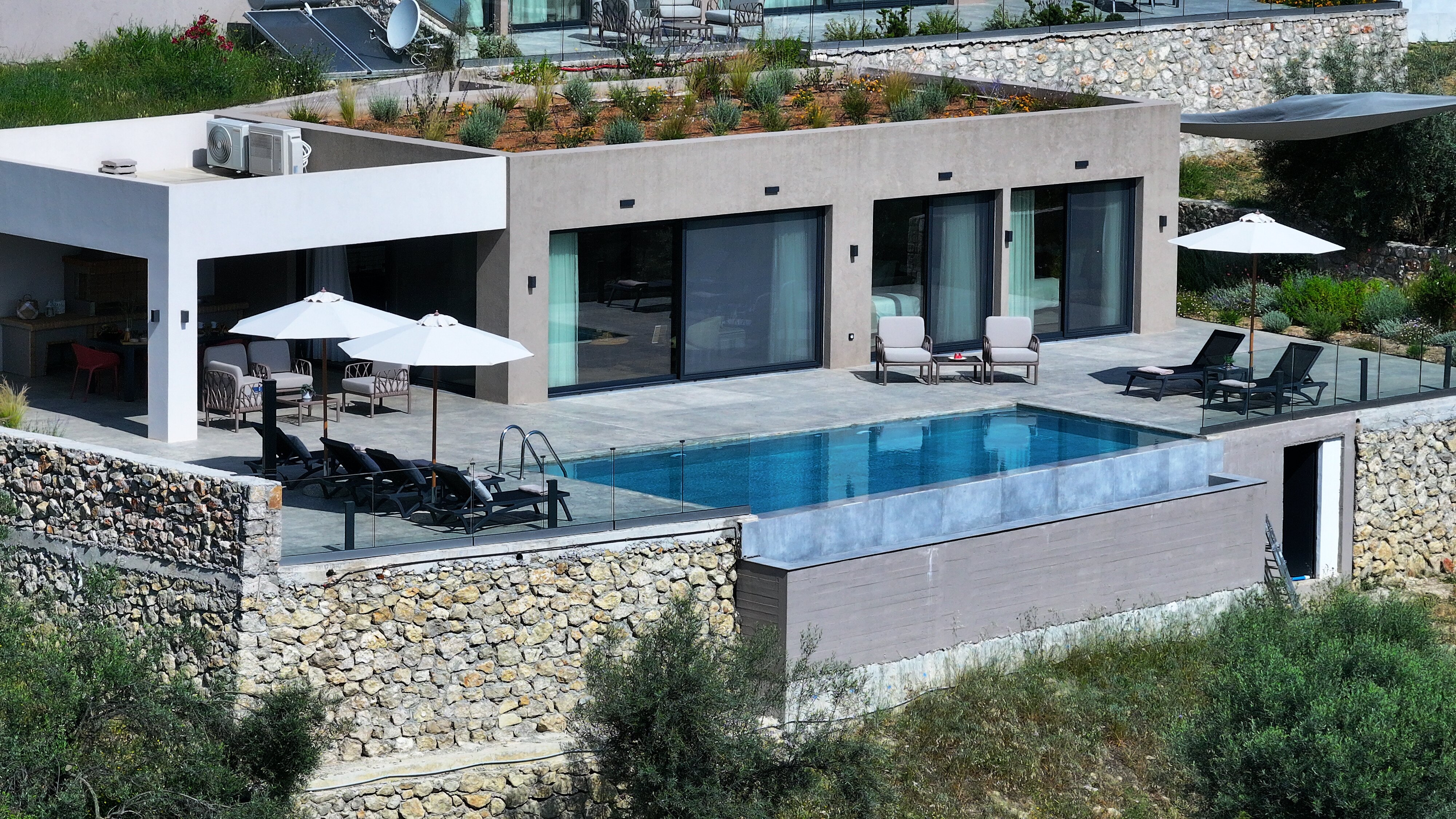 Villa Dahlia is a contemporary two-bedroom villa in Lefkada, Greece, boasting sleek, stylish interiors and a relaxing infinity pool area, all surrounded by a sea of natural greenery.